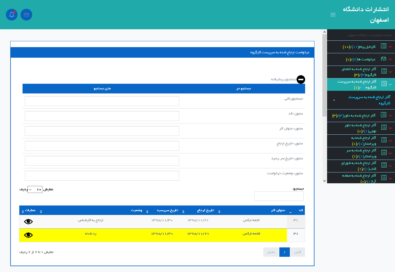 دراین جدول آثاری که سرپرست کارگروه ارجاع شده است نمایش داده می شود