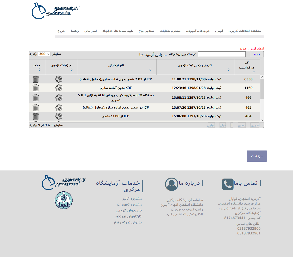 جدول همه سوابق آزمون ها نمونه های کاربر با قابلیت جستجوی هوشمند